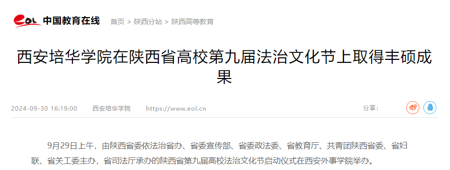 9月29日上午,由陕西省委依法治省办、省委宣传部、省委政法委、省教育厅、共青团陕西省委、省妇联、省关工委主办,省司法厅承办的陕西省第九届高校法治文化节启动仪式在西安外事学院举办。