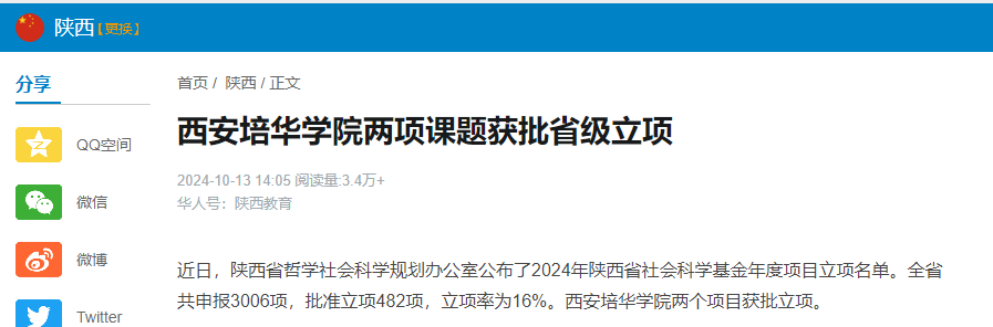 近日,陕西省哲学社会科学规划办公室公布了2024年陕西省社会科学基金年度项目立项名单。全省共申报3006项,批准立项482项,立项率为16%。西安培华学院两个项目获批立项。