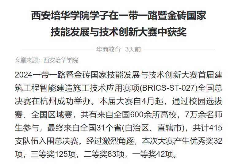 西安培华学院智能科学与工程学院本次参赛取得的成绩,不仅证明了参赛学生的专业能力和技能水平,也体现了学院在培养高素质技术技能人才方面所作出的努力和取得的成果,将有助于师生大力弘扬工匠精神,促进社会对劳动和技能的重视,推动职业教育高质量发展,为社会培养更多优秀的应用型专门人才。后续,学校将继续以学科竞赛为抓手,进一步加强学科专业建设和教学改革创新,提升学生实践能力和创新思维,为国家建筑事业高质量发展培养更多的优秀人才。