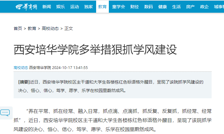 “养在平常、抓在经常、融入日常,抓点滴、点滴抓,抓反复、反复抓,抓经常、经常抓。”近日,西安培华学院校区主干道和大学生各楼栋红色标语格外醒目,呈现了该院抓学风建设的决心、恒心、信心,笃学、愿学、乐学在校园里蔚然成风。