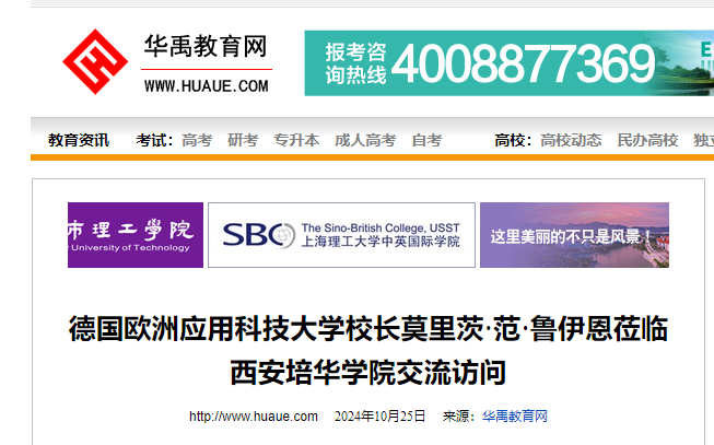 10月16日,德国欧洲应用科技大学校长莫里茨·范·鲁伊恩来西安培华学院交流访问。西安培华学院理事长姜波博士、副校长刘越莲教授、国际校长李华教授、国际交流中心主任王鹏与来宾座谈交流,并举行签约仪式。