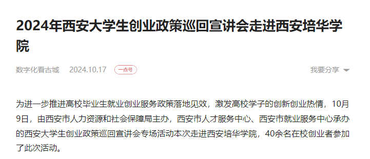 为进一步推进高校毕业生就业创业服务政策落地见效,激发高校学子的创新创业热情,10月9日,由西安市人力资源和社会保障局主办,西安市人才服务中心、西安市就业服务中心承办的西安大学生创业政策巡回宣讲会专场活动本次走进西安培华学院,40余名在校创业者参加了此次活动。
