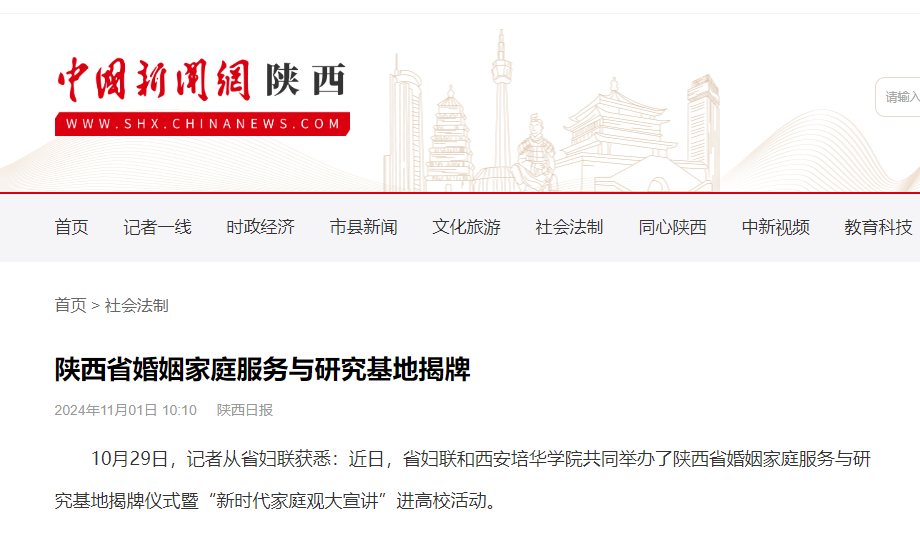 10月29日,记者从省妇联获悉:近日,省妇联和西安培华学院共同举办了陕西省婚姻家庭服务与研究基地揭牌仪式暨“新时代家庭观大宣讲”进高校活动。