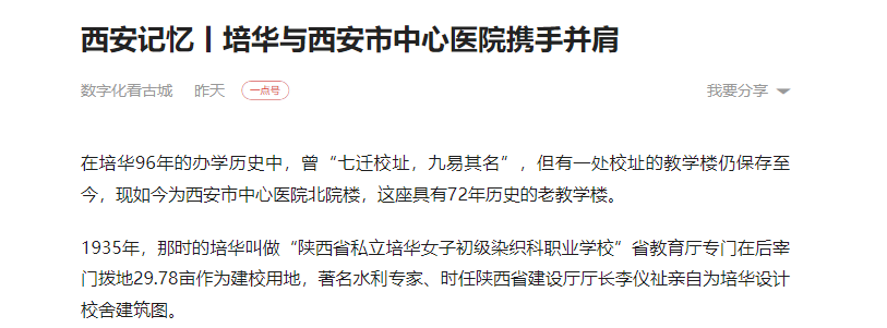 在培华96年的办学历史中,曾“七迁校址,九易其名”,但有一处校址的教学楼仍保存至今,现如今为西安市中心医院北院楼,这座具有72年历史的老教学楼。