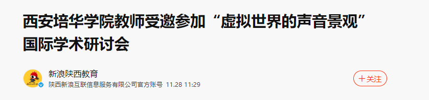 11月21日至24日,第五届国际大学生配音大赛“虚拟世界的声音景观”国际学术会研讨会在浙江省绍兴举行,来自中国、日本、马来西亚等国的一百多位专家学者、业界精英、硕博研究生参加研讨会。西安培华学院传媒与设计学院老师陈连龙、曲少为受邀参会并进行分享。