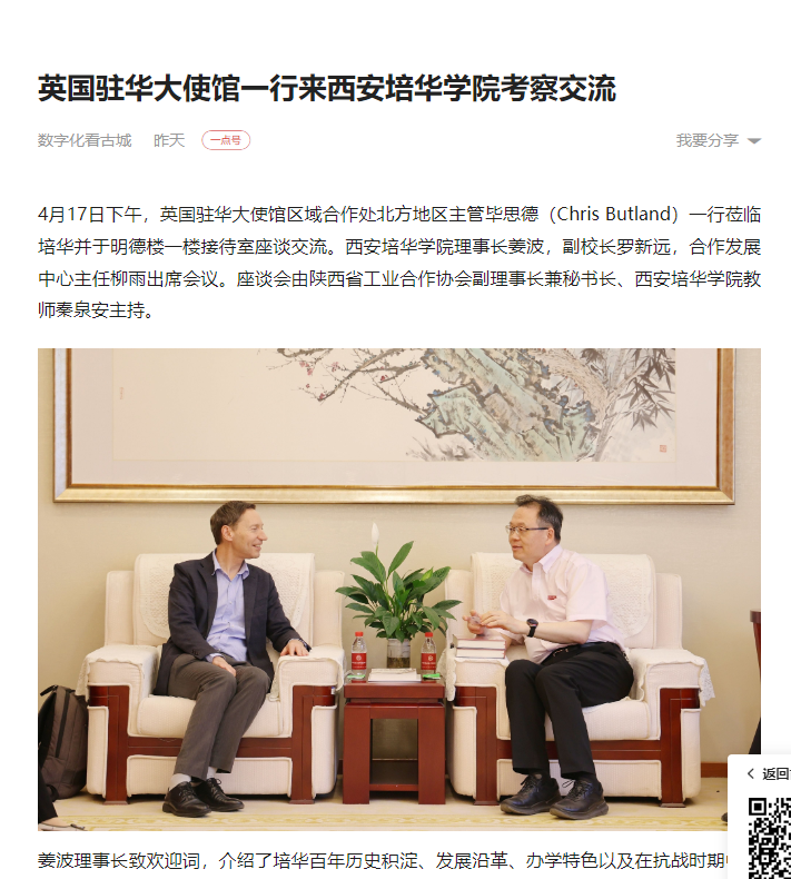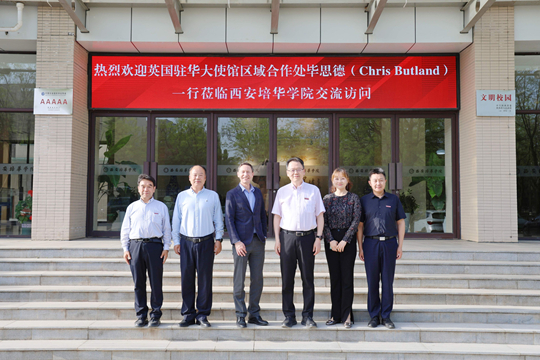 4月17日下午,英国驻华大使馆区域合作处北方地区主管毕思德(Chris Butland)一行莅临西安培华学院并于明德楼一楼接待室座谈交流。西安培华学院理事长姜波,副校长罗新远,合作发展中心主任柳雨出席会议。座谈会由陕西省工业合作协会副理事长兼秘书长、西安培华学院教师秦泉安主持。