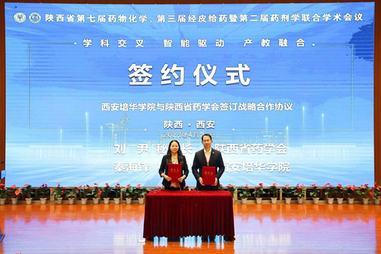 西安培华学院校长助理秦海锋与陕西省药学会秘书长刘尹签署合作框架协议书,旨在搭建学科建设交流平台,达成深度合作,共同推动产教融合、人才培养、科学研究、成果转化等方面的创新与发展。