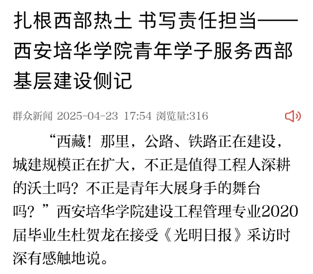 “西藏!那里,公路、铁路正在建设,城建规模正在扩大,不正是值得工程人深耕的沃土吗?不正是青年大展身手的舞台吗?”西安培华学院建设工程管理专业2020届毕业生杜贺龙在接受《光明日报》采访时深有感触地说。
