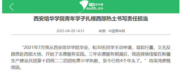 西安培华学院于在风起云涌的大革命时代诞生,在抗战烽火中升华,在共和国旗帜下成长,在改革开放浪潮中奋进,在新时代逐梦中图强。一代代培华人用救国之心、爱国之举、报国之情、兴国之梦、强国之志创建了培华昨天的辉煌,描绘了培华明天的希望。历史的接力棒又交到新一代培华人手上。迈步在中华民族伟大复兴征程上的培华青年用行动证明:选择基层不是选择平凡,而是选择成为时代的脊梁;扎根西部不是单向奉献,而是在广阔天地中实现人生价值的升华。这种双向奔赴,正是新时代青年最动人的姿态。