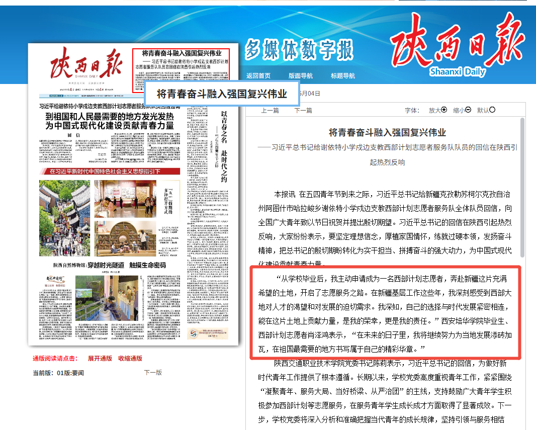 在五四青年节到来之际,习近平总书记给新疆克孜勒苏柯尔克孜自治州阿图什市哈拉峻乡谢依特小学戍边支教西部计划志愿者服务队全体队员回信,向全国广大青年致以节日祝贺并提出殷切期望。习近平总书记的回信在陕西引起热烈反响,大家纷纷表示,要坚定理想信念,厚植家国情怀,练就过硬本领,发扬奋斗精神,把总书记的殷切期盼转化为实干担当、拼搏奋斗的强大动力,为中国式现代化建设贡献青春力量。