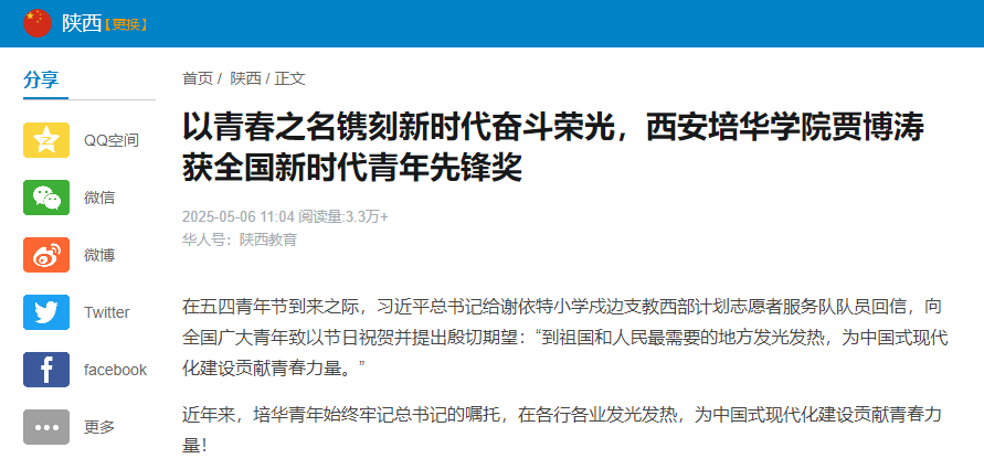 在刚刚过去的陕西省青年联合会第十三届委员会中,贾博涛又当选青联委员,他说“站在新的起点上,我将以实际行动为答卷,不负时代赋予的使命。”