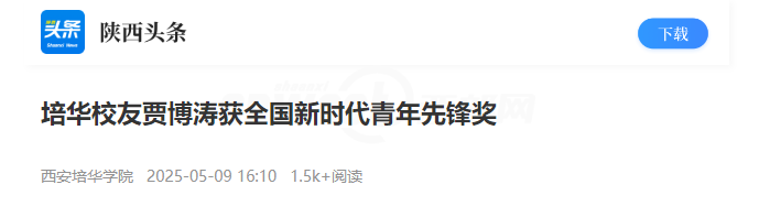 近日,经党和国家功勋荣誉表彰工作委员会同意,共青团中央、全国青联授予在科技创新、乡村振兴、绿色发展、社会服务、卫国戍边等领域表现突出的新时代青年“新时代青年先锋奖”。西安培华学院2020届校友、渭南校友会会长贾博涛荣获“新时代青年先锋奖”。