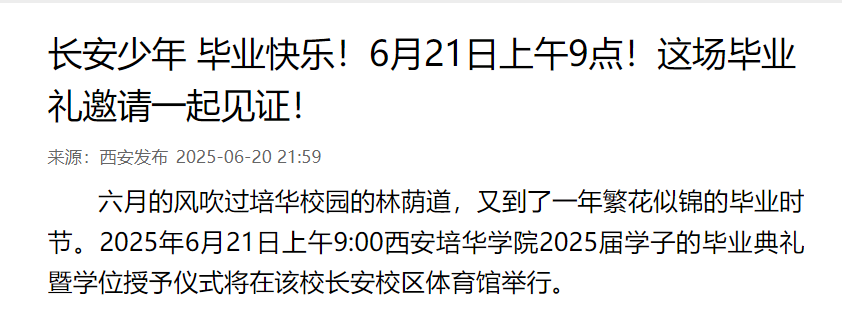 六月的风吹过培华校园的林荫道,又到了一年繁花似锦的毕业时节。2025年6月21日上午9:00西安培华学院2025届学子的毕业典礼暨学位授予仪式将在该校长安校区体育馆举行。