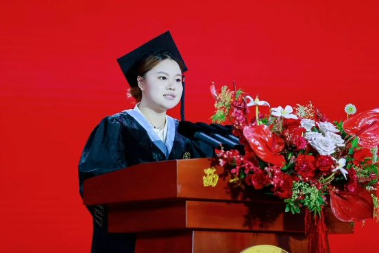 会计与金融学院毕业生、西部计划志愿者李健乐代表全体毕业生发言,她深情回顾了在培华度过的四年宝贵时光,感恩母校对她的悉心栽培,并重申了“知行合一”这一教育理念的重要性。她表示,自己已入选“大学生志愿服务西部计划”,将赴新疆生产建设兵团十二师从事基层工作,并以此号召全体毕业生牢记“校誉至上、质量第一、自强不息、开拓前进”的校训,像“蒲公英”一样扎根祖国需要的地方,让青春在奉献中闪光。