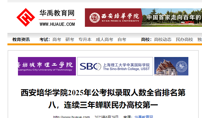 据6月20日有关单位发布的“2025年陕西公务员拟聘用人员毕业学校统计”显示,全省拟录用6659人,其中127人毕业于西安培华学院,拟录用人数位列全省高校第八位、民办高校第一位。据统计,2023年至2025年三年间,学校在全省录用公务员统一考试中录用人数分别位列全省第九、第七和第八,稳居同类院校第一位。