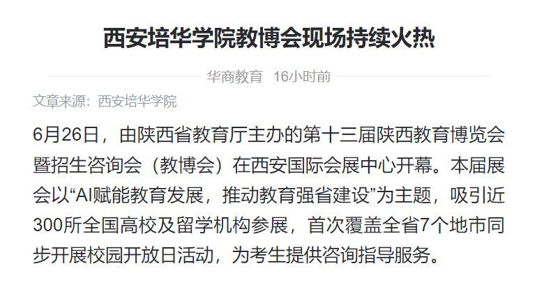 6月26日,由陕西省教育厅主办的第十三届陕西教育博览会暨招生咨询会(教博会)在西安国际会展中心开幕。本届展会以“AI赋能教育发展,推动教育强省建设”为主题,吸引近300所全国高校及留学机构参展,首次覆盖全省7个地市同步开展校园开放日活动,为考生提供咨询指导服务。