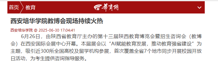 6月26日,由陕西省教育厅主办的第十三届陕西教育博览会暨招生咨询会(教博会)在西安国际会展中心开幕。本届展会以“AI赋能教育发展,推动教育强省建设”为主题,吸引近300所全国高校及留学机构参展,首次覆盖全省7个地市同步开展校园开放日活动,为考生提供咨询指导服务。