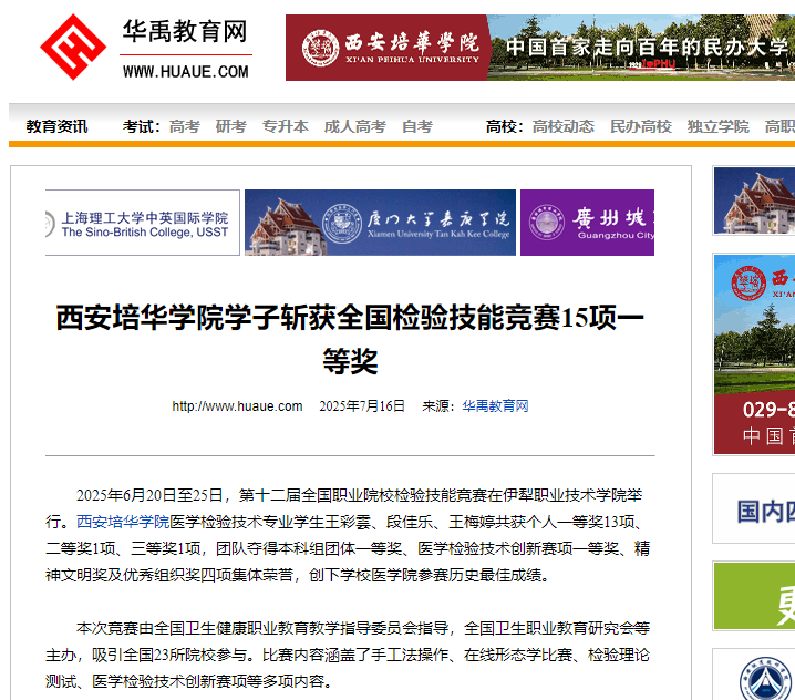 2025年6月20日至25日,第十二届全国职业院校检验技能竞赛在伊犁职业技术学院举行。西安培华学院医学检验技术专业学生王彩雲、段佳乐、王梅婷共获个人一等奖13项、二等奖1项、三等奖1项,团队夺得本科组团体一等奖、医学检验技术创新赛项一等奖、精神文明奖及优秀组织奖四项集体荣誉,创下学校医学院参赛历史最佳成绩。