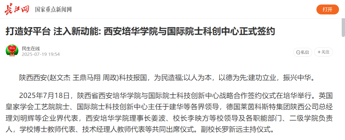 2025年7月18日,陕西省西安培华学院与国际院士科技创新中心战略合作签约仪式在培华举行。英国皇家学会工艺院院士、国际院士科技创新中心主任于建华等各界领导,德国莱茵科斯特集团陕西公司总经理刘明辉等企业界代表,西安培华学院理事长姜波、校长李映方等校领导及各职能部门、二级学院负责人,学校博士教师代表、技术经理人教师代表等共同出席仪式。副校长罗新远主持仪式。