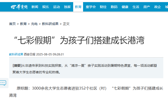 从非遗文化传承到科技实践探索,从“清凉一夏”亲子实践活动到暑期特色课堂,每一项活动都凝聚着大学生志愿者的专业和热情。今年暑期,团市委以“七彩假期”爱心托管班为载体,组织动员3000余名大学生志愿者进驻352个社区(村),为孩子们搭建起一个充实、快乐、有意义的成长港湾。