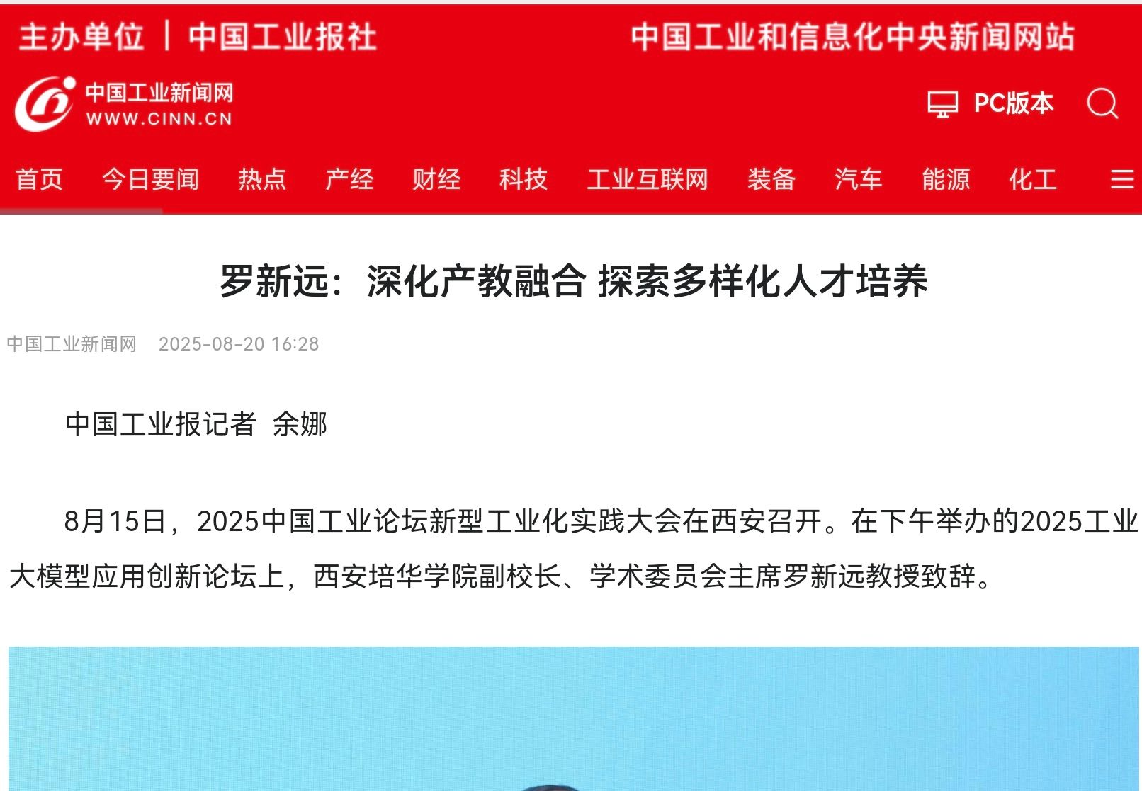 8月15日,2025中国工业论坛新型工业化实践大会在西安召开。在下午举办的2025工业大模型应用创新论坛上,西安培华学院副校长、学术委员会主席罗新远教授致辞。