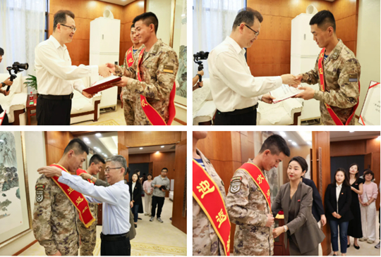 随后,党委书记刘锋、副书记姚文静为两位校友佩戴“欢迎返校”绶带,姜波理事长为他们颁发“杰出校友”荣誉证书,表彰他们在阅兵中的非凡风采以及为校争光的突出表现。