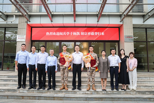 初秋的培华校园丹桂飘香、阵阵秋雨送来丝丝凉爽。9月11日清晨,西安培华学院校园内电子屏“热烈欢迎杨凯、胡宗祥参加九三阅兵凯旋归来”格外耀眼。刚刚参加完“九三阅兵”的2022届校友杨凯、2024届校友胡宗祥身着笔挺戎装返回母校,与师长和学弟学妹分享成长经历。