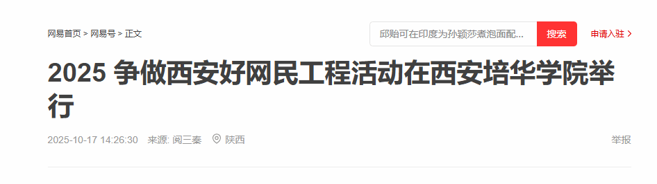 为激励广大网民自觉提升网络素养,善用网络传播正能量,以理性之声、青春之笔,共同描绘西安文明形象,争做有责任感、有法治意识、有奉献精神的西安好网民。10月16日下午,由西安市委网信办主办的“网络文明进校园 学子同心树新风”——2025 争做西安好网民工程活动在西安培华学院举行。