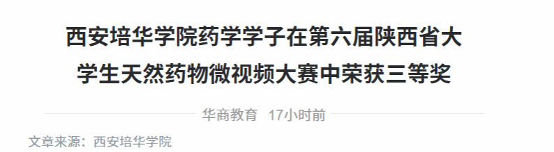 在陕西省天然药物学会主办的第六届陕西省大学生天然药物微视频大赛中,西安培华学院医学院药学专业学生团队荣获专业组三等奖。该团队由梁雪老师指导,成员包括2023级药学专业朱佳怡、李欣昀,以及2024级药学专业向冰冰、苗琳曼。其作品凭借扎实的专业基础与富有创意的表达,从全省133件参赛作品中脱颖而出,充分展现了培华学子的专业素养与核心竞争力。