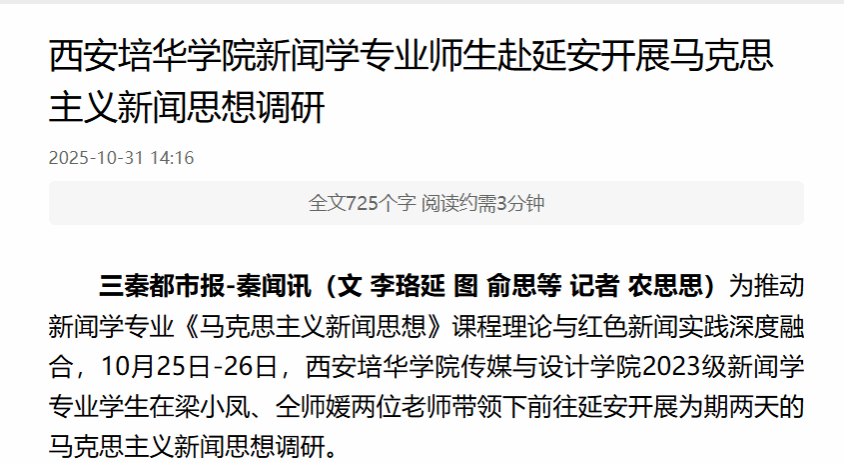 三秦都市报-秦闻讯(文 李珞延 图 俞思等 记者 农思思)为推动新闻学专业《马克思主义新闻思想》课程理论与红色新闻实践深度融合,10月25日-26日,西安培华学院传媒与设计学院2023级新闻学专业学生在梁小凤、仝师媛两位老师带领下前往延安开展为期两天的马克思主义新闻思想调研。