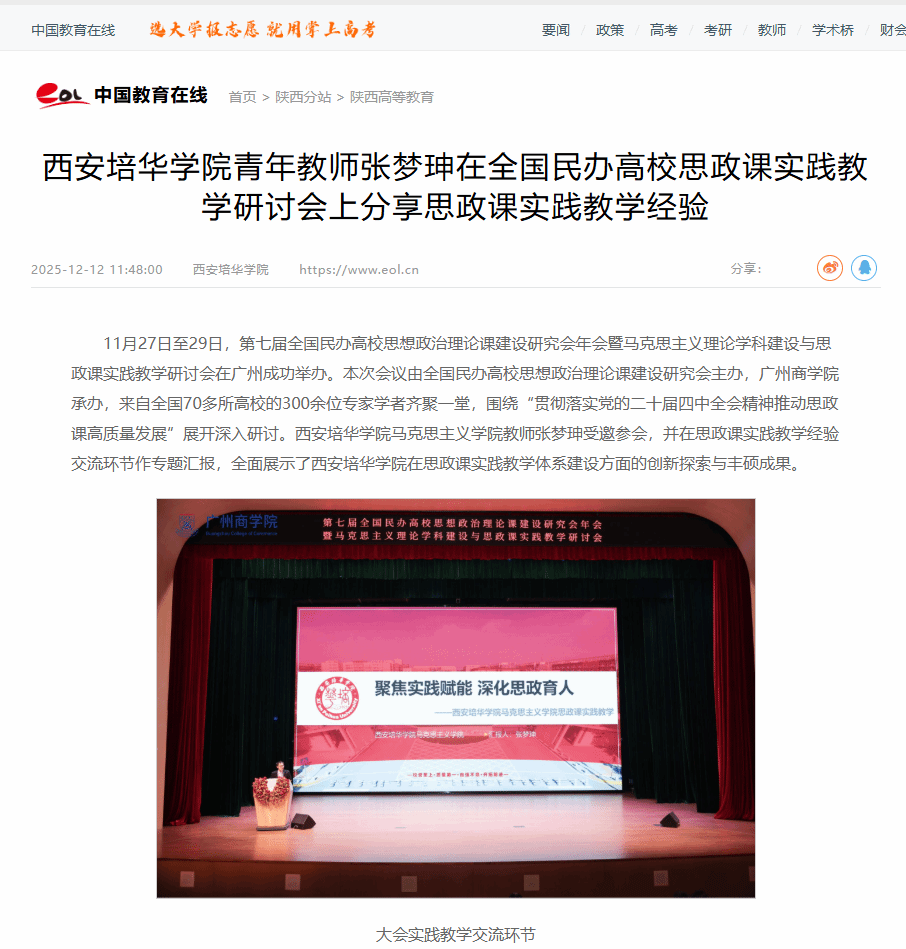 11月27日至29日,第七届全国民办高校思想政治理论课建设研究会年会暨马克思主义理论学科建设与思政课实践教学研讨会在广州成功举办。本次会议由全国民办高校思想政治理论课建设研究会主办,广州商学院承办,来自全国70多所高校的300余位专家学者齐聚一堂,围绕“贯彻落实党的二十届四中全会精神推动思政课高质量发展”展开深入研讨。西安培华学院马克思主义学院教师张梦珅受邀参会,并在思政课实践教学经验交流环节作专题汇报,全面展示了西安培华学院在思政课实践教学体系建设方面的创新探索与丰硕成果。