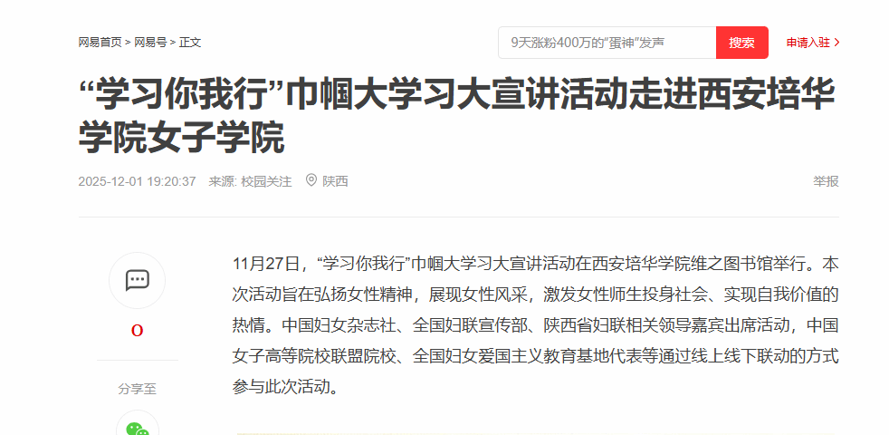 一直以来,西安培华学院始终坚持将思政教育与女性教育有机结合,把家国情怀、社会责任、奋斗精神融入人才培养全过程。学校先后涌现出一大批优秀女性校友,她们中有扎根基层的创业者,有深耕行业的领军者,有奉献社会的公益人,在各自的岗位上践行着培华人的初心与使命,展现着新时代女性的别样风采。本次巾帼大学习大宣讲活动,正是学校思政教育与女性教育的又一次生动实践,通过榜样的力量,引导青年女性树立正确的世界观、人生观、价值观,让她们在成长路上既有“仰望星空”的理想追求,又有“脚踏实地”的奋斗精神。