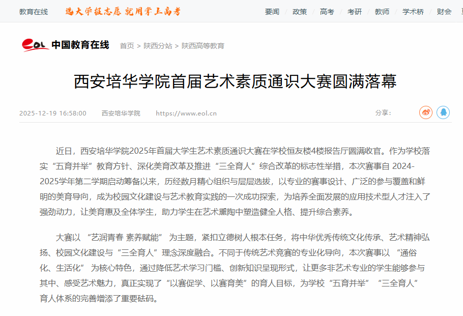 近日,西安培华学院2025年首届大学生艺术素质通识大赛在学校恒友楼4楼报告厅圆满收官。作为学校落实“五育并举”教育方针、深化美育改革及推进“三全育人”综合改革的标志性举措,本次赛事自 2024-2025学年第二学期启动筹备以来,历经数月精心组织与层层选拔,以专业的赛事设计、广泛的参与覆盖和鲜明的美育导向,成为校园文化建设与艺术教育实践的一次成功探索,为培养全面发展的应用技术型人才注入了强劲动力,让美育惠及全体学生,助力学生在艺术熏陶中塑造健全人格、提升综合素养。 大赛以 “艺润青春 素养赋能” 为主题,紧扣立德树人根本任务,将中华优秀传统文化传承、艺术精神弘扬、校园文化建设与“三全育人”理念深度融合。不同于传统艺术竞赛的专业化导向,本次赛事以 “通俗化、生活化” 为核心特色,通过降低艺术学习门槛、创新知识呈现形式,让更多非艺术专业的学生能够参与其中、感受艺术魅力,真正实现了“以赛促学、以赛育美”的育人目标,为学校“五育并举”“三全育人” 育人体系的完善增添了重要砝码。