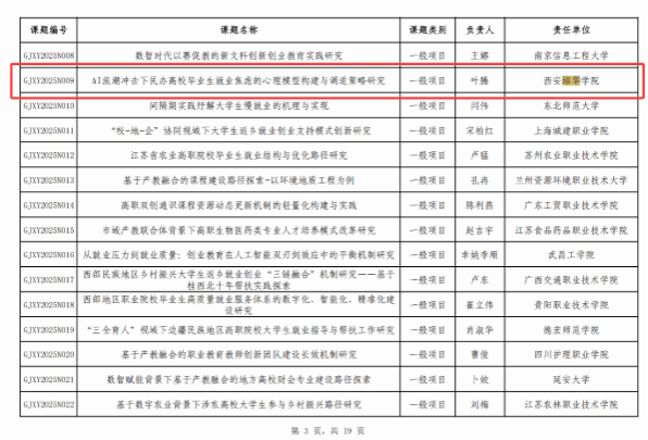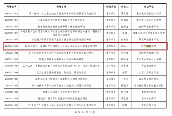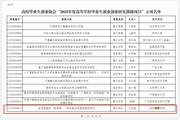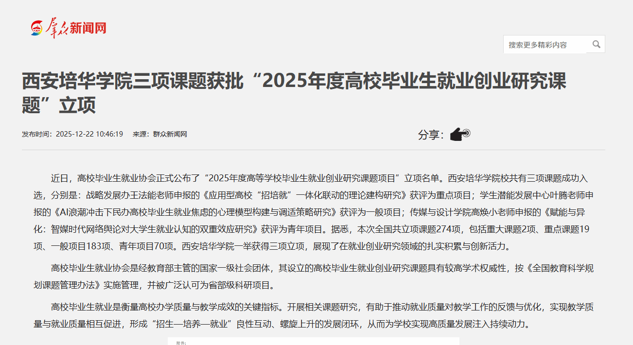 近日,高校毕业生就业协会正式公布了“2025年度高等学校毕业生就业创业研究课题项目”立项名单。西安培华学院校共有三项课题成功入选,分别是:战略发展办王法能老师申报的《应用型高校“招培就”一体化联动的理论建构研究》获评为重点项目;学生潜能发展中心叶腾老师申报的《AI浪潮冲击下民办高校毕业生就业焦虑的心理模型构建与调适策略研究》获评为一般项目;传媒与设计学院高焕小老师申报的《赋能与异化:智媒时代网络舆论对大学生就业认知的双重效应研究》获评为青年项目。据悉,本次全国共立项课题274项,包括重大课题2项、重点课题19项、一般项目183项、青年项目70项。西安培华学院一举获得三项立项,展现了在就业创业研究领域的扎实积累与创新活力。