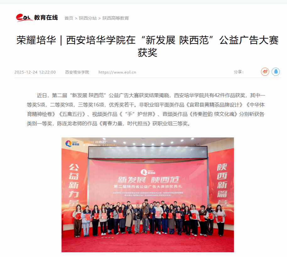 本次大赛中西安培华学院传媒与设计学院高度重视,围绕“宣传组织、组队选拔、培训指导、带队参赛”四大关键环节,构建全流程工作体系,确保参赛工作有序高效推进。学生作品创作以“中国式现代化进程中的陕西”为核心,通过公益广告形式生动传播社会正能量,参赛作品既有“传统文化”等文化传承类佳作,也有“铭记历史,缅怀先烈”等红色教育主题作品,更有“弘扬中华体育精神”等展现新时代奋斗风貌的作品,充分体现了学院在思政育人中的创新实践与文化底蕴。传媒与设计学院将以本次大赛为契机,构建“以赛促教、以赛促学、以赛促创”的长效机制,推动参赛工作常态化、精品化发展。