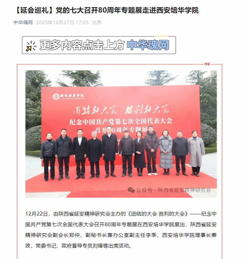 12月22日,由陕西省延安精神研究会主办的《团结的大会 胜利的大会》——纪念中国共产党第七次全国代表大会召开80周年专题展在西安培华学院展出,陕西省延安精神研究会副会长郑仲、副秘书长兼办公室副主任李季,西安培华学院理事长姜波,党委书记、政府督导专员刘锋等出席活动。