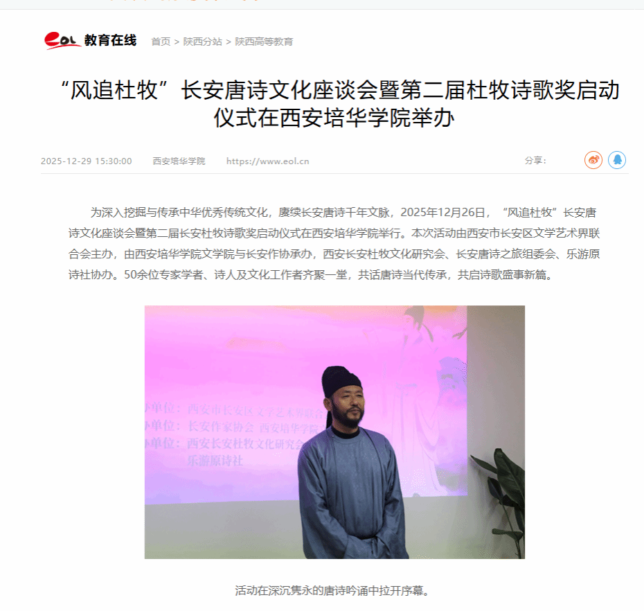 为深入挖掘与传承中华优秀传统文化,赓续长安唐诗千年文脉,2025年12月26日,“风追杜牧”长安唐诗文化座谈会暨第二届长安杜牧诗歌奖启动仪式在西安培华学院举行。本次活动由西安市长安区文学艺术界联合会主办,由西安培华学院文学院与长安作协承办,西安长安杜牧文化研究会、长安唐诗之旅组委会、乐游原诗社协办。50余位专家学者、诗人及文化工作者齐聚一堂,共话唐诗当代传承,共启诗歌盛事新篇。