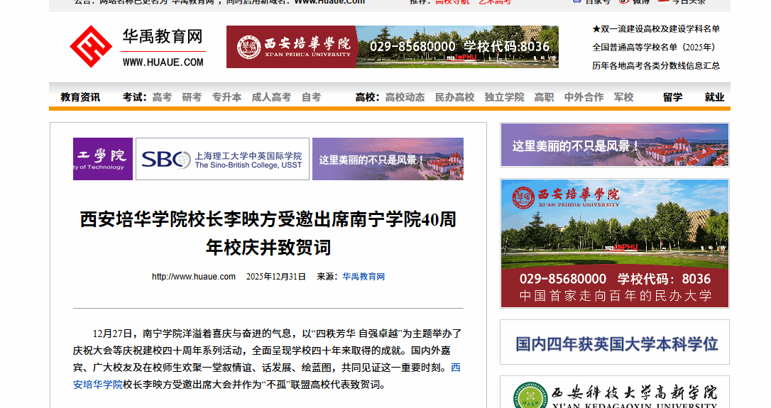 12月27日,南宁学院洋溢着喜庆与奋进的气息,以“四秩芳华 自强卓越”为主题举办了庆祝大会等庆祝建校四十周年系列活动,全面呈现学校四十年来取得的成就。国内外嘉宾、广大校友及在校师生欢聚一堂叙情谊、话发展、绘蓝图,共同见证这一重要时刻。西安培华学院校长李映方受邀出席大会并作为“不孤”联盟高校代表致贺词。