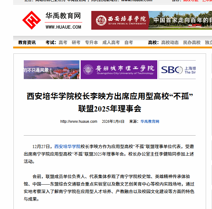 12月27日,西安培华学院校长李映方作为应用型高校“不孤”联盟理事单位代表,受邀出席南宁学院应用型高校“不孤”联盟2025年理事年会。校长办公室主任李健陪同参加上述活动。