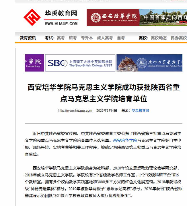 此次进入省级重点马克思主义学院培育单位行列,是对学校和学院多年建设成果的一次检验,也标志着马克思主义学院发展进入了新阶段。西安培华学院将以此为契机,聚焦落实立德树人根本任务,全面对标《普通高等学校马克思主义学院建设标准》要求,进一步加强马克思主义理论学科建设,着力推进“大思政课”建设,深化思政课改革创新,推动马克思主义学院实现高质量发展,为培养德智体美劳全面发展的社会主义建设者和接班人贡献更大力量。