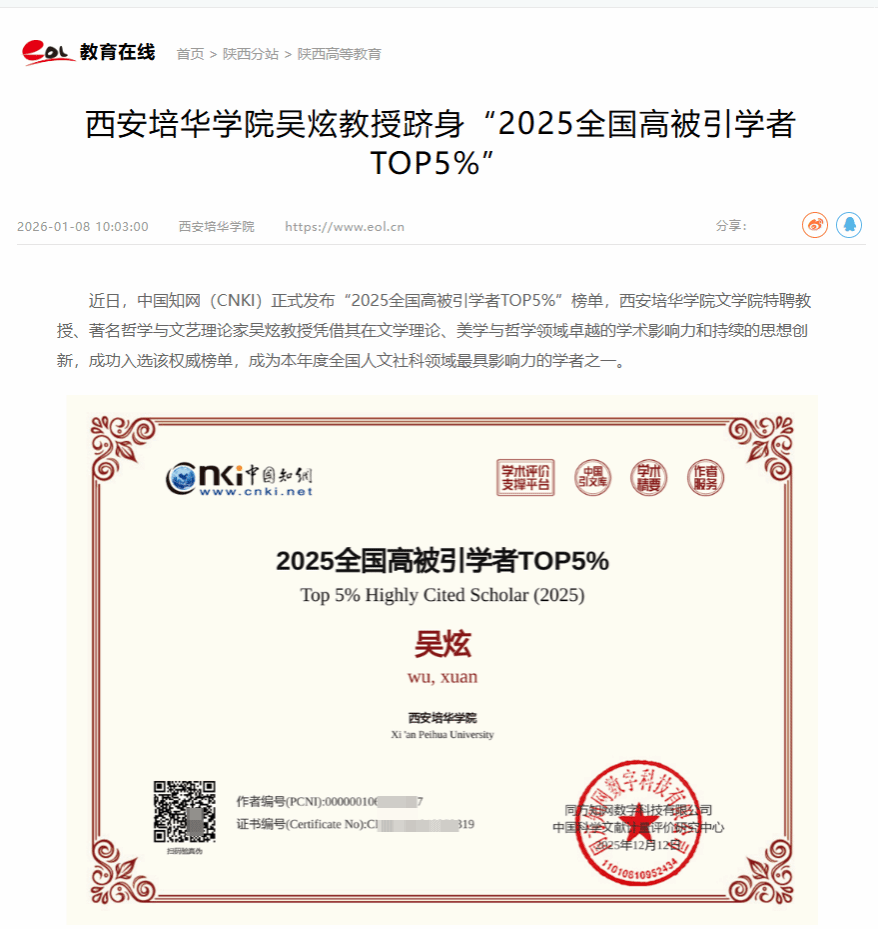 近日,中国知网(CNKI)正式发布“2025全国高被引学者TOP5%”榜单,西安培华学院文学院特聘教授、著名哲学与文艺理论家吴炫教授凭借其在文学理论、美学与哲学领域卓越的学术影响力和持续的思想创新,成功入选该权威榜单,成为本年度全国人文社科领域最具影响力的学者之一。
