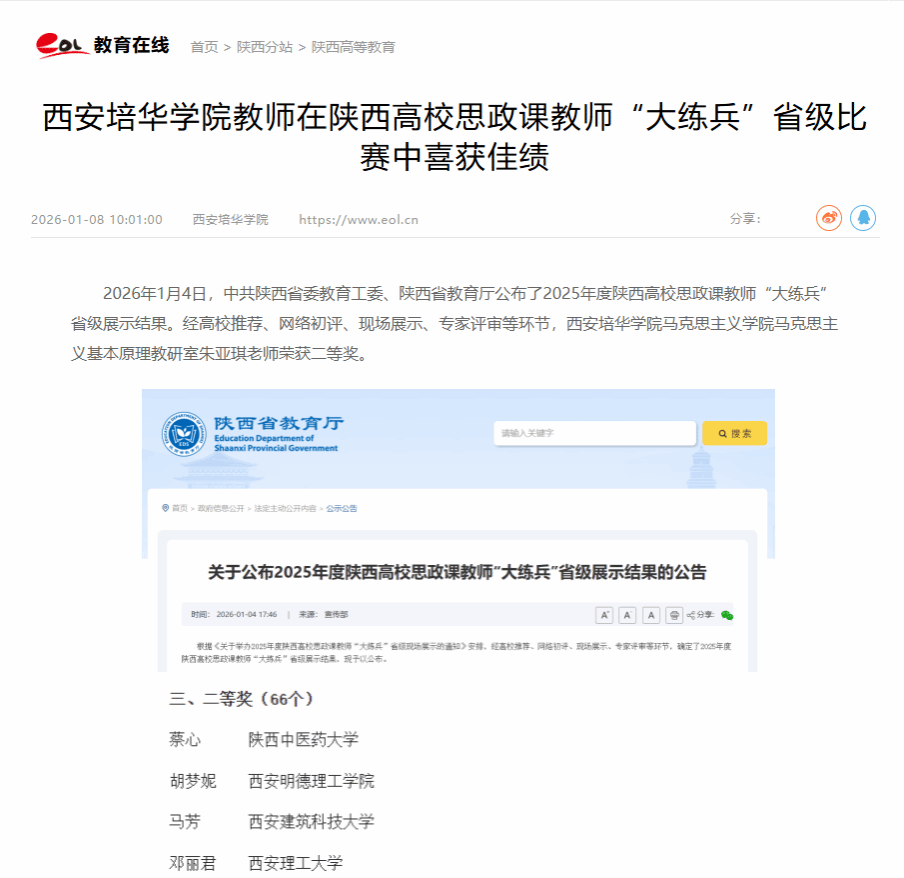 2026年1月4日,中共陕西省委教育工委、陕西省教育厅公布了2025年度陕西高校思政课教师“大练兵”省级展示结果。经高校推荐、网络初评、现场展示、专家评审等环节,西安培华学院马克思主义学院马克思主义基本原理教研室朱亚琪老师荣获二等奖。