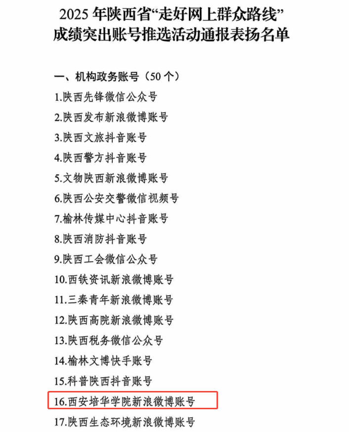 近日,陕西省委网信办公布了2025年陕西省“走好网上群众路线”成绩突出账号推选结果,西安培华学院官方微博荣获2025年陕西省“走好网上群众路线”成绩突出账号。该评选面向全省党政机关、企事业单位、社会团体等各领域新媒体账号展开,经过严格评审,西安培华学院官方微博从全省三百余个参评账号中脱颖而出,并成为陕西省同类院校中唯一获此殊荣的单位,彰显了学校在网络阵地建设与思想政治引领方面的显著成效。