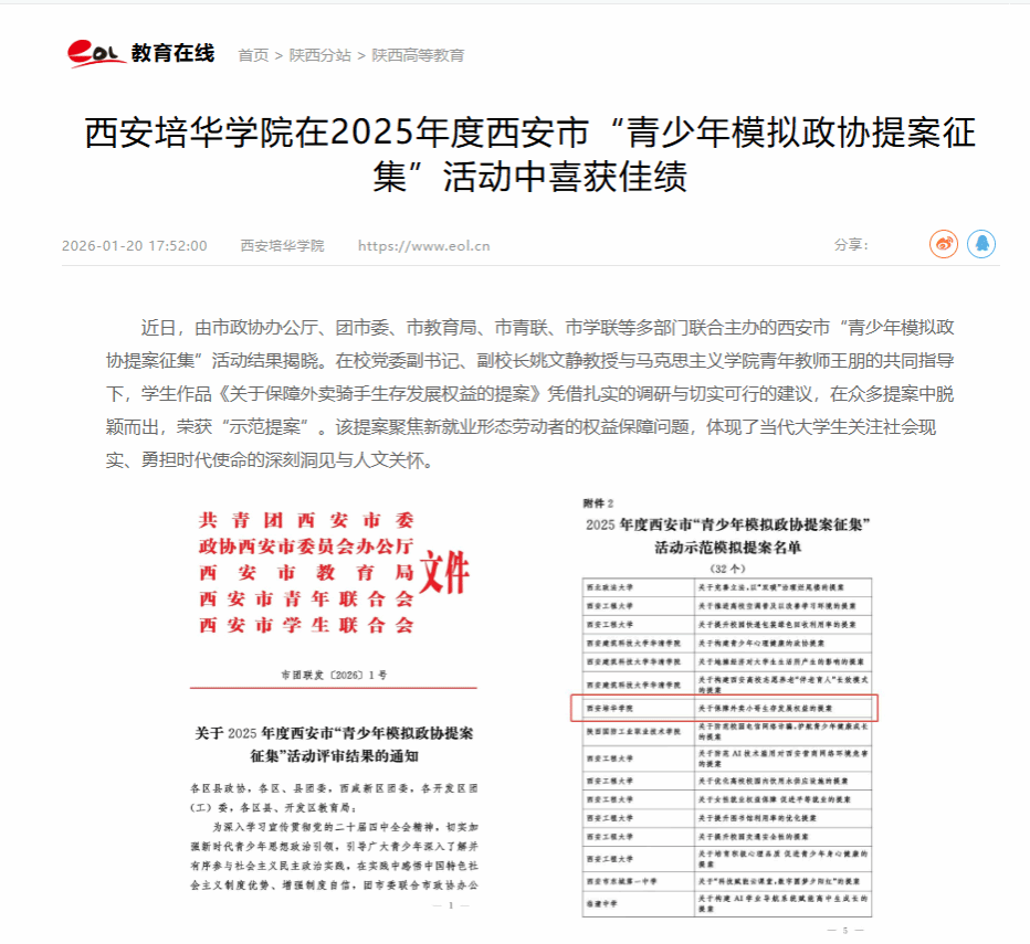 近日,由西安市政协办公厅、团市委、市教育局、市青联、市学联等多部门联合主办的西安市“青少年模拟政协提案征集”活动结果揭晓。在西安培华学院党委副书记、副校长姚文静教授与马克思主义学院青年教师王朋的共同指导下,学生作品《关于保障外卖骑手生存发展权益的提案》凭借扎实的调研与切实可行的建议,在众多提案中脱颖而出,荣获“示范提案”。该提案聚焦新就业形态劳动者的权益保障问题,体现了当代大学生关注社会现实、勇担时代使命的深刻洞见与人文关怀。