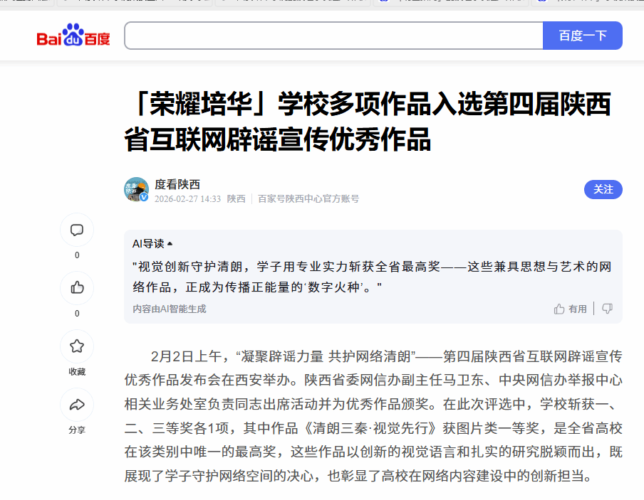 近年来,学校将网络育人深度融入“大思政”格局,积极构建清朗网络空间,注重顶层设计,依托专业优势,建立师生共创机制,引导创作聚焦时代主题与社会关切的网络文化精品。此次在第四届陕西省互联网辟谣宣传优秀作品评选中,学校选送的视觉设计作品兼具思想性、艺术性与传播力,集中体现了学校在网络文化创作领域的专业实力与育人导向。学校坚持“创作与传播并重”,通过多维平台推广优秀作品,使创作过程本身成为提升学生网络素养、增强社会责任感的生动实践课堂。学校将继续深化内容创作,让优秀网络作品成为传播正能量、培育时代新人的“数字火种”,共筑清朗网络空间。