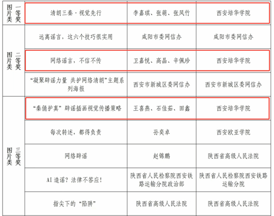 2月2日上午,“凝聚辟谣力量 共护网络清朗”——第四届陕西省互联网辟谣宣传优秀作品发布会在西安举办。陕西省委网信办副主任马卫东、中央网信办举报中心相关业务处室负责同志出席活动并为优秀作品颁奖。在此次评选中,西安培华学院斩获一、二、三等奖各1项,其中作品《清朗三秦·视觉先行》获图片类一等奖,是全省高校在该类别中唯一的最高奖,这些作品以创新的视觉语言和扎实的研究脱颖而出,既展现了学子守护网络空间的决心,也彰显了高校在网络内容建设中的创新担当。