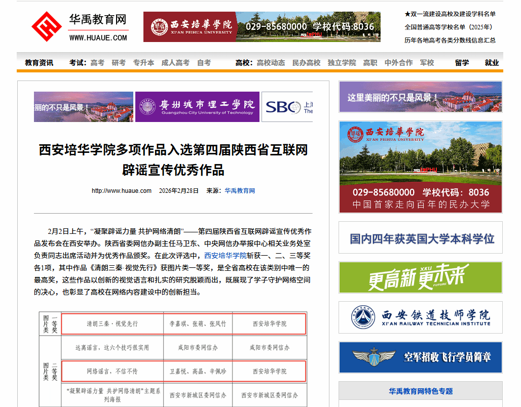 近年来,西安培华学院将网络育人深度融入“大思政”格局,积极构建清朗网络空间,注重顶层设计,依托专业优势,建立师生共创机制,引导创作聚焦时代主题与社会关切的网络文化精品。此次在第四届陕西省互联网辟谣宣传优秀作品评选中,学校选送的视觉设计作品兼具思想性、艺术性与传播力,集中体现了学校在网络文化创作领域的专业实力与育人导向。学校坚持“创作与传播并重”,通过多维平台推广优秀作品,使创作过程本身成为提升学生网络素养、增强社会责任感的生动实践课堂。学校将继续深化内容创作,让优秀网络作品成为传播正能量、培育时代新人的“数字火种”,共筑清朗网络空间。