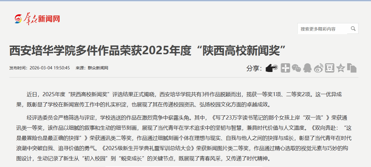 近日,2025年度“陕西高校新闻奖”评选结果正式揭晓,西安培华学院共有3件作品脱颖而出,揽获一等奖1项、二等奖2项。这一优异成果,既彰显了学校在新闻宣传工作中的扎实积淀,也展现了其在传递校园资讯、弘扬校园文化方面的卓越成效。