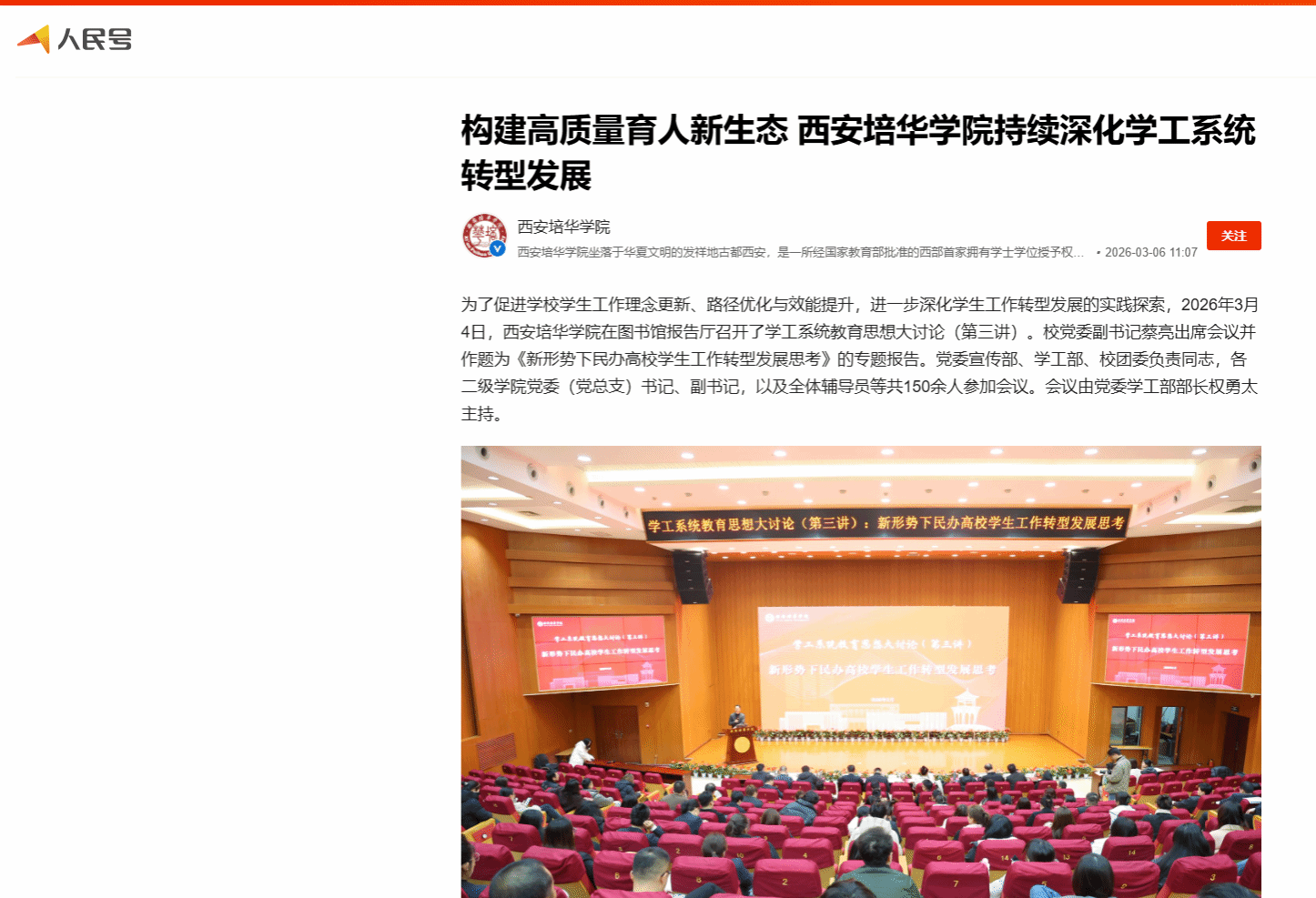 为了促进学校学生工作理念更新、路径优化与效能提升,进一步深化学生工作转型发展的实践探索,2026年3月4日,西安培华学院在图书馆报告厅召开了学工系统教育思想大讨论(第三讲)。校党委副书记蔡亮出席会议并作题为《新形势下民办高校学生工作转型发展思考》的专题报告。党委宣传部、学工部、校团委负责同志,各二级学院党委(党总支)书记、副书记,以及全体辅导员等共150余人参加会议。会议由党委学工部部长权勇太主持。