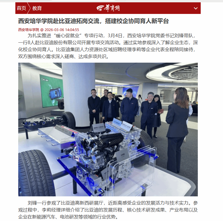 此次访企拓岗不仅拓宽了毕业生就业渠道,更搭建起校企长效交流平台,为后续持续深化合作奠定了坚实基础。西安培华学院将以此次合作为契机,持续深化“访企拓岗促就业”专项行动,常态化对接比亚迪等优质企业,精准匹配岗位需求、优化人才培养方案,切实把访企拓岗成效转化为毕业生高质量就业的实际成果,助力毕业生逐梦职场、实现价值。